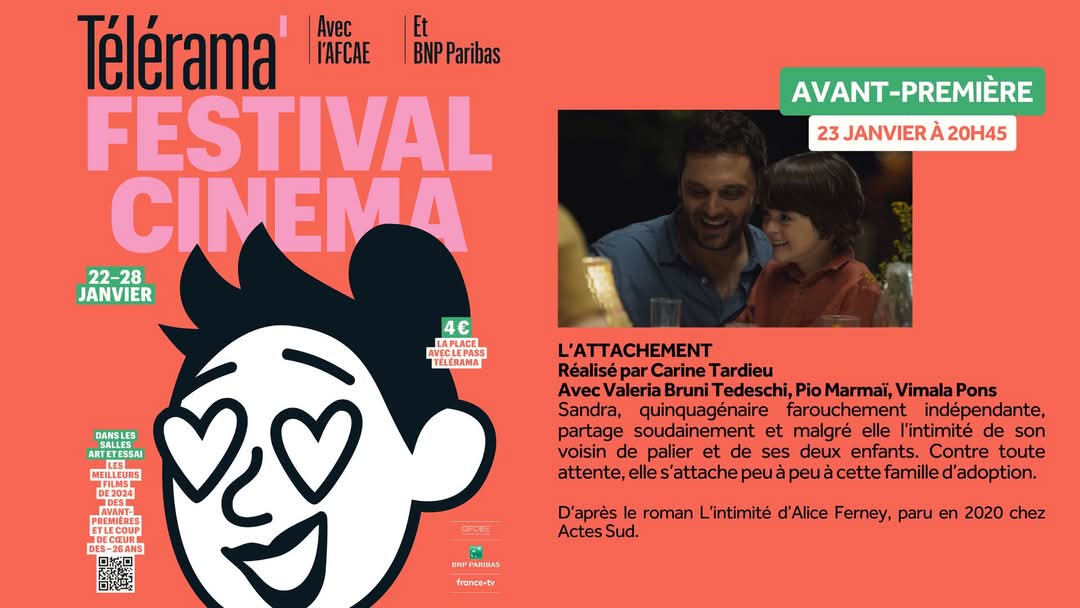 A l’occasion de la 27e édition du Festival Télérama qui aura lieu du 22 au 28 janvier 2025, venez découvrir en avant-première L’ATTACHEMENT de Carine Tardieu.
