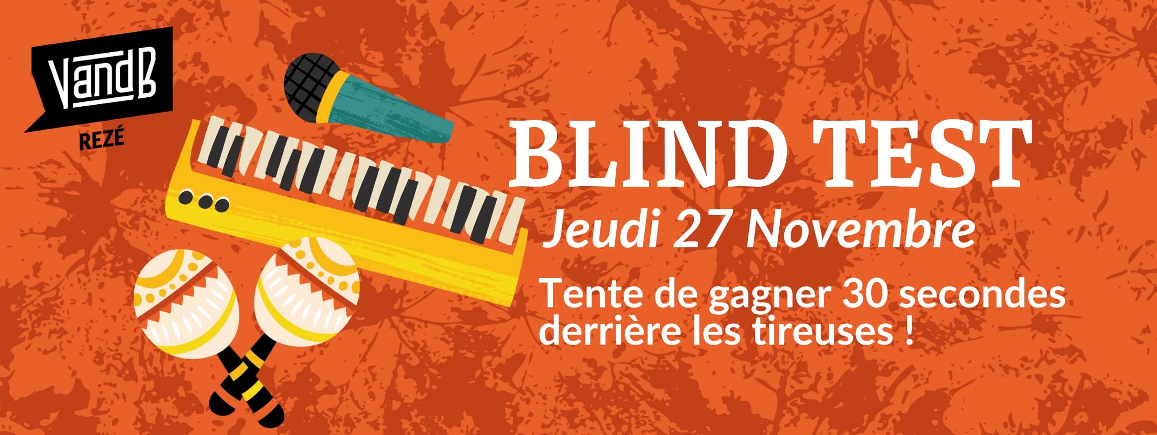 Détails Date: novembre 27 Heure: 19:00 - 20:00 Catégorie d'événements: Tournois Lieu V And B Rezé 44 rue Ernest SauvestreRezé Participe au Blind Test et tente de gagner 30 secondes derrière les tireuses ! 🍀🍺 Similaire