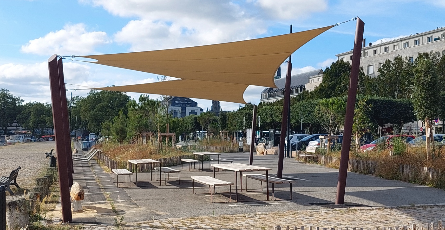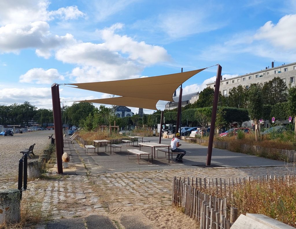Deux sites bénéficient actuellement de ce dispositif peut on lire sur Ouest-France. L’un se situe près de la gare, sur le quai Malakoff, avec 85 m² de voile d’ombrage, et l’autre allée Alain-Gerbault, sur l’île de Nantes avec 60 m². L’objectif de ces installations est de permettre aux habitants de bénéficier de zones ombragées lors de fortes chaleurs. Effectivement, avec le réchauffement climatique, ces épisodes caniculaires sont de plus en plus récurrents. Parmi donc les solutions proposées par la ville de Nantes, figure ce dispositif de voilages d’ombrage dont 150 devraient pousser dans la cité des ducs.
