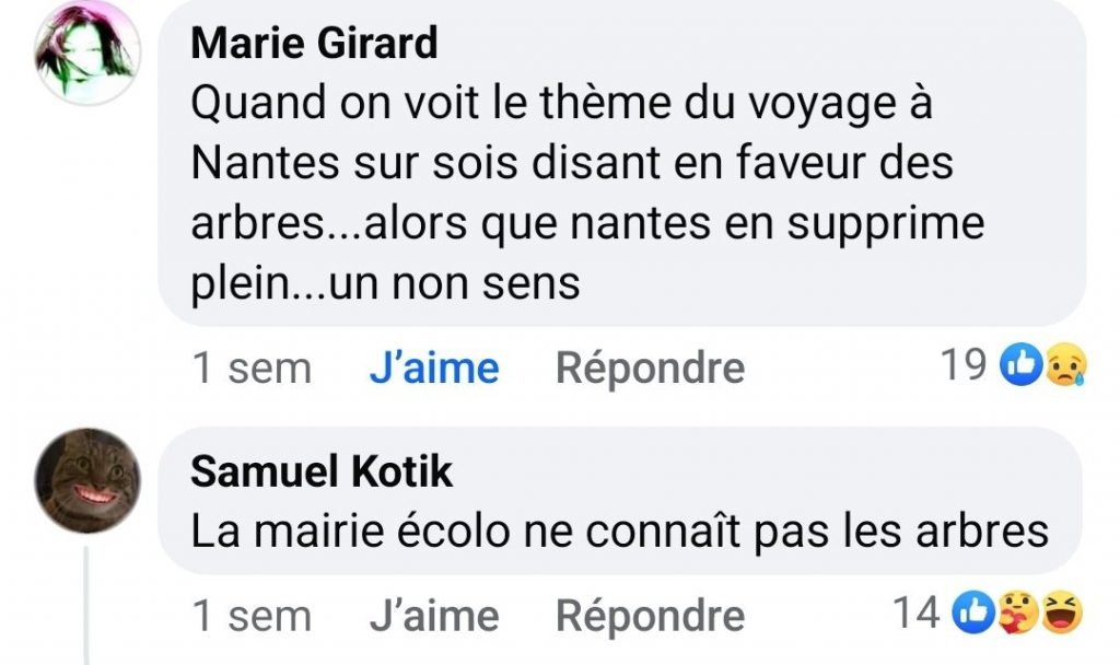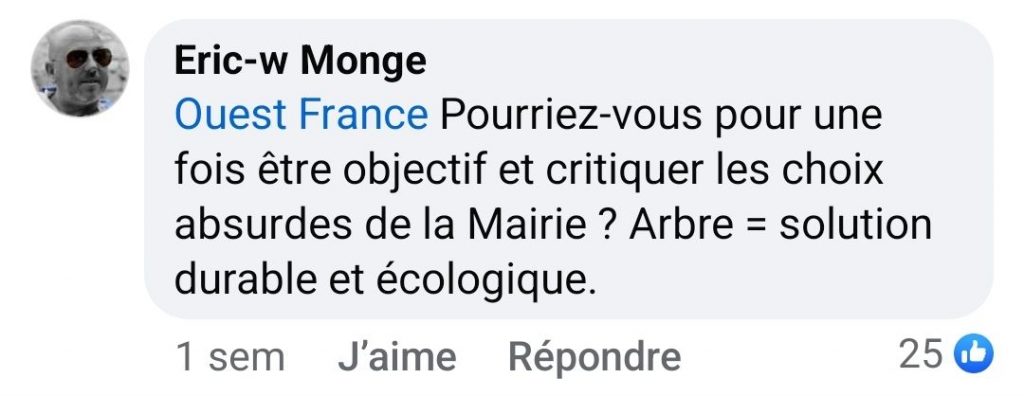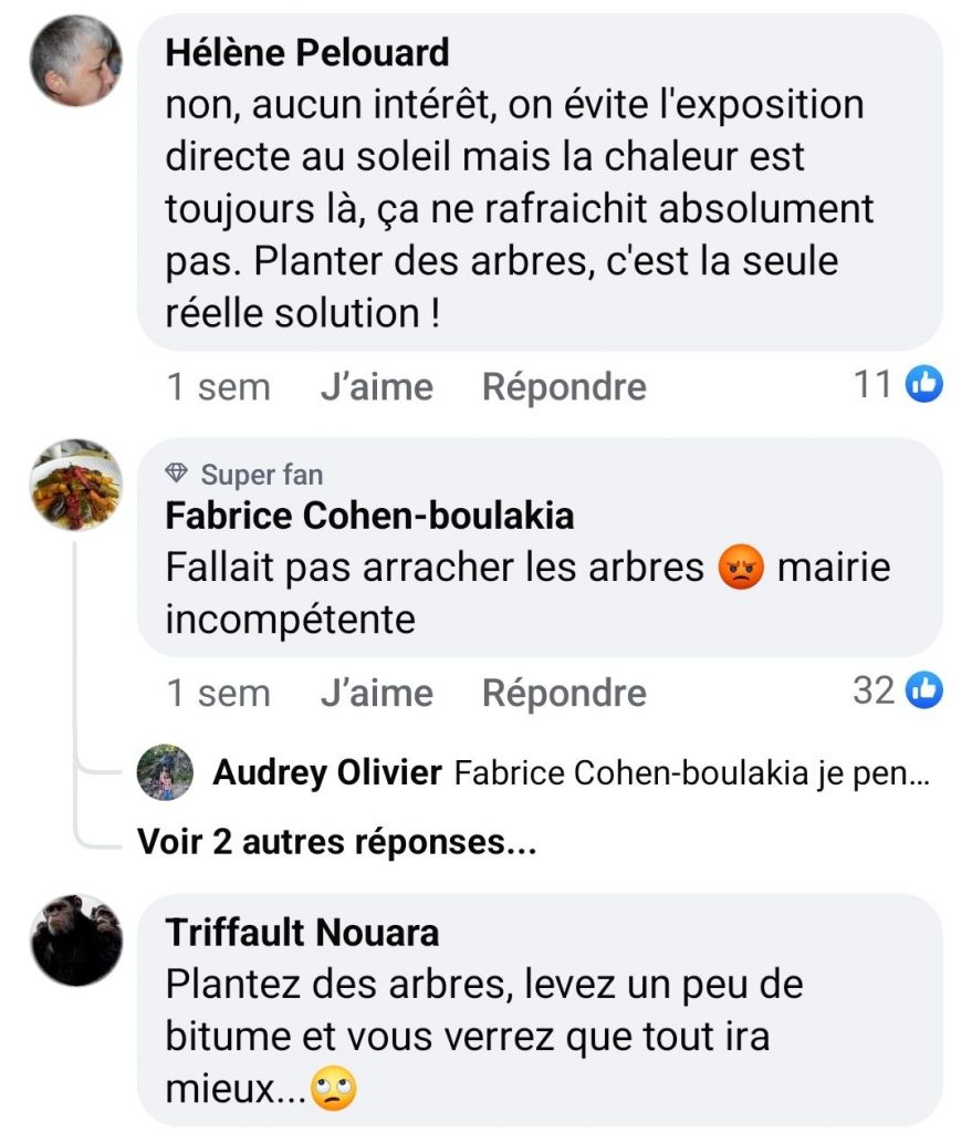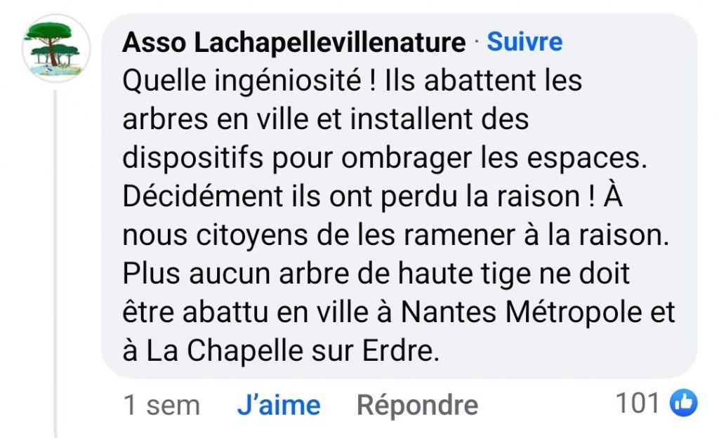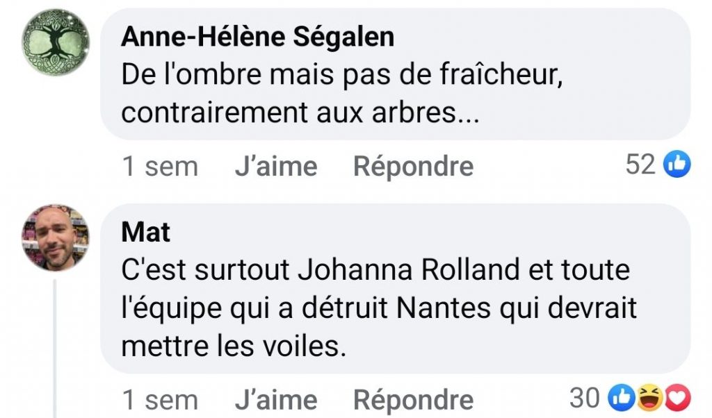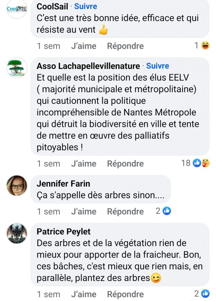 D’après les premières réactions que l’on a pu lire sur les réseaux sociaux de Ouest-France qui a publié cette information, les nantais ne sont pas convaincus. Et c’est le moins que l’on puisse dire ! Les nantais semblent reprocher à la ville de Nantes d’avoir fait arracher des arbres qui auraient pu, eux, créer de l’ombre naturellement. Extraits :